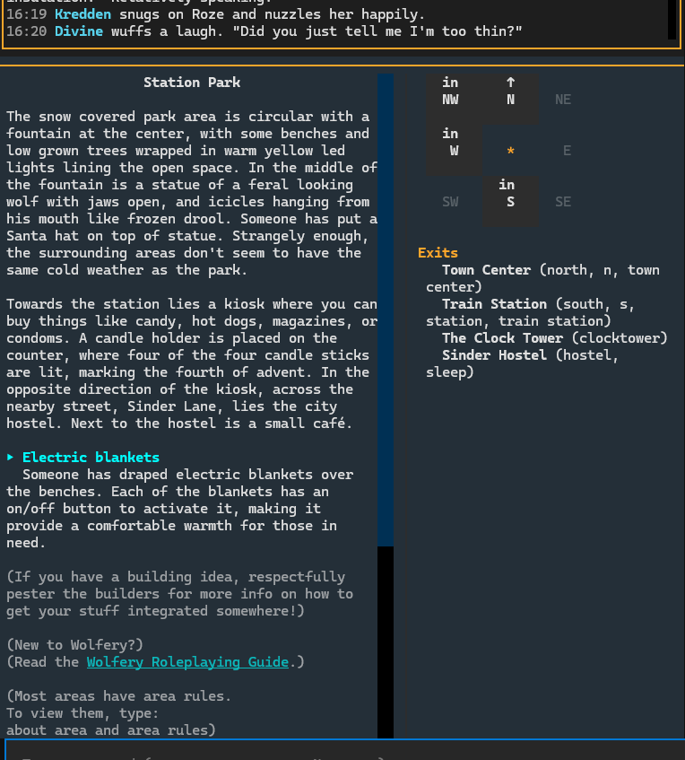 I have developed a console version of the wolfery client, in a project I am calling yreflow. Right now the software should be considered alpha quality. It doesn’t support new user flow, and I’m sure there’s a ton of bugs to track down, and it’s not full featured. The release is on github here: yreflow. There’s a lot of information about the client, including a list of supported commands on the github page.