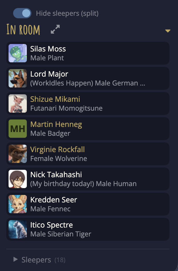 - Creates a collapsable list of players who fall into the ether asleep (i.e. their character is no longer controlled) or idle (‘red names’, those who are marked ‘idle’ by the system).