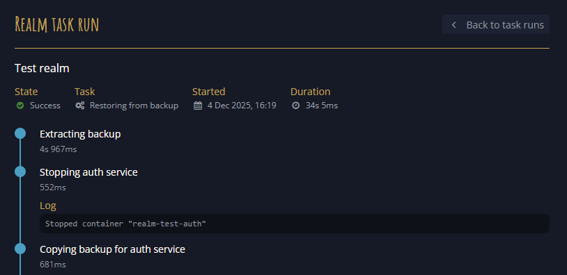 This includes a backup system built on a task run system, allowing us to run tasks to backup and restore realms.